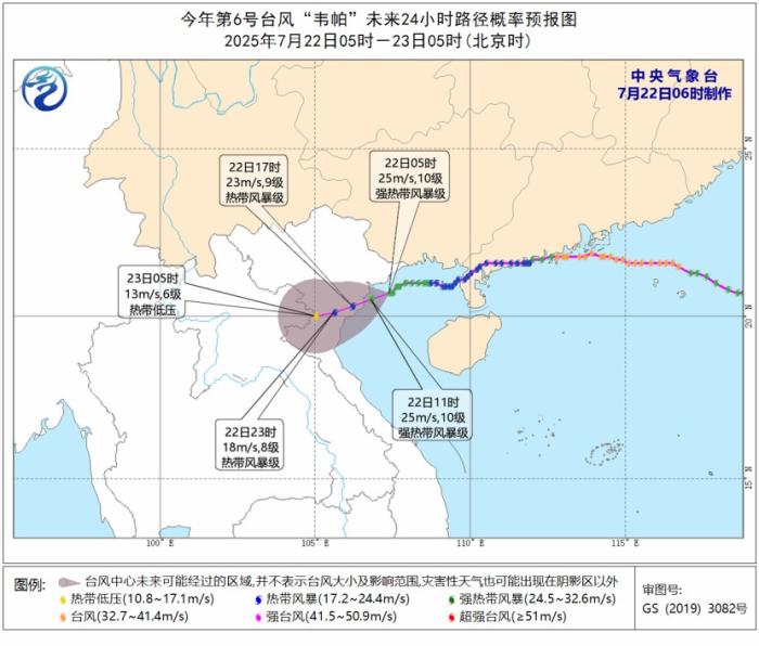7月22日08时至23日08时,受“韦帕”和西南季风的共同影响,南海大部、北部湾、琼州海峡、西沙群岛、中沙群岛、南沙群岛以及海南岛沿海、广东西南部沿海、广西沿海等地将有6~7级风,阵风8~9级,其中北部湾、广西沿海、海南岛西部沿海的风力可达8~9级,阵风10~11级,北部湾部分海域风力有10级,阵风11~12级。中央气象台7月22日06时继续发布台风黄色预警。