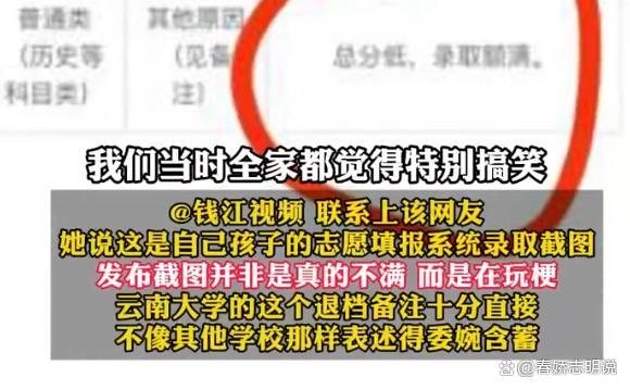 云南大学未录取 通知备注“总分低” 招生透明化引讨论。高考招录期间,一位网友晒出动态称自己填报了云南大学但未被录取,系统显示校方备注为“总分低,录取额满”。该网友在动态中表示:“不要我就不要我,何苦要加这几个字羞辱‘本宫’。”不过她随后解释说,发布截图并非真的不满,而是在玩梗。