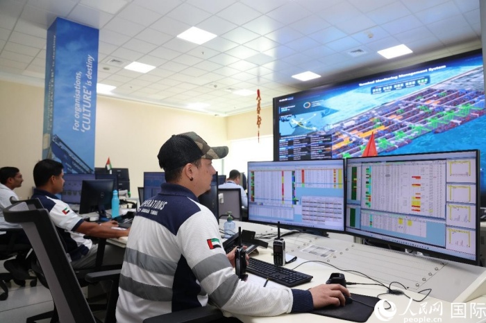 与会嘉宾会后到中远海运港口阿布扎比码头中央控制室参观。图为工作人员使用数字孪生系统查看作业情况。人民网记者 任皓宇摄