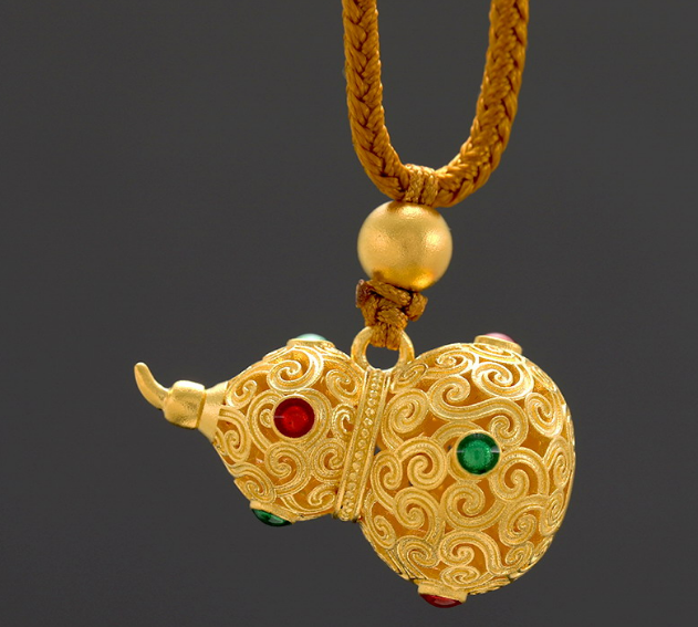 花丝镶嵌这门“指尖上的非遗”,更是被珂霖金铺玩出了新花样。福禄康宁花丝吊坠以镂空花丝勾勒卷草纹,丝丝缕缕如发丝般纤细,却撑起“如意安康,福满花开”的厚重寓意;光面花丝葫芦吊坠则让花丝与油压工艺结合,编织缠绕的葫芦造型温润素雅,既保留“福禄双至”的传统祝福,又因工艺精进让金饰更显轻盈。