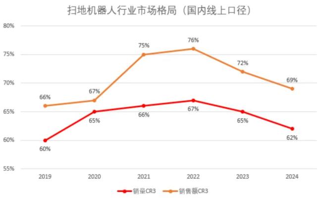 然而2022年后,情况开始逆转。技术红利的扩散降低了行业门槛,为更多后发品牌创造了入场与竞争机会。2022-2024年间,销量CR3由67%回落至62%,销售额CR3也从76%降至69%。