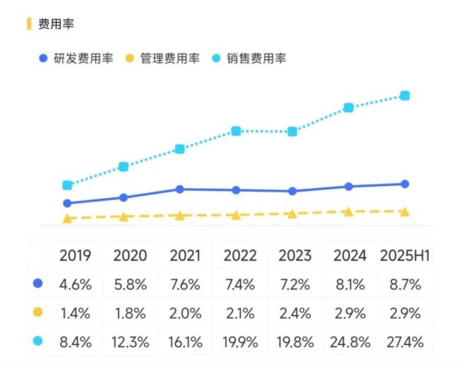 其一是销售费用的大幅增长。2024年时,石头科技的销售费用率就已高达24.84%。2025年上半年,这一指标进一步升至27.39%,对应21.65亿的销售费用较上年同期足足多出了近13亿。