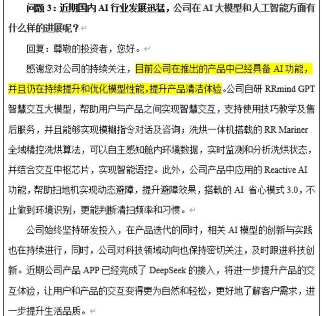 例如,石头科技在3月的调研中就曾透露,其产品已具备RRmind GPT智慧交互大模型、Reactive AI动态避障等AI功能,并且仍在持续提升和优化模型性能。