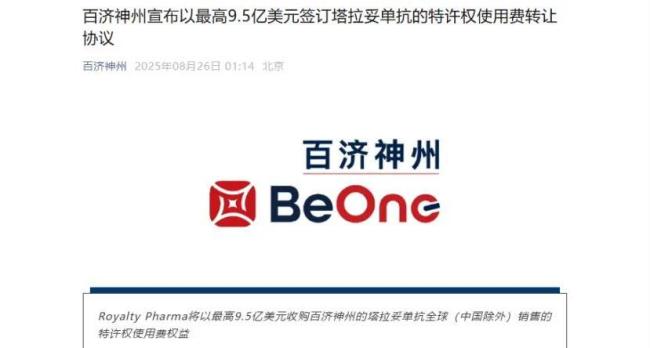 8月25日,百济神州宣布与Royalty Pharma签订特许权使用费购买协议。后者支付8.85亿美元首付款,获得百济神州旗下塔拉妥单抗(Imdelltra,tarlatamab)在中国以外地区销售的特许权使用费权益。