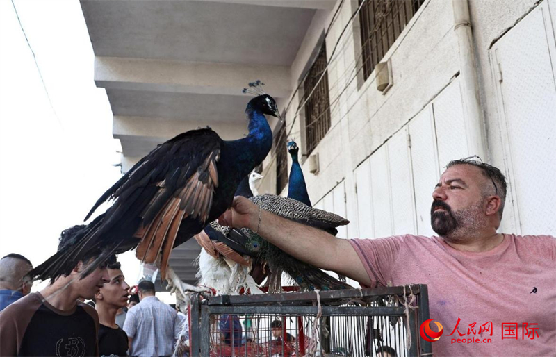 一名商贩在逗弄孔雀。人民网 伊纳斯·易卜拉欣摄