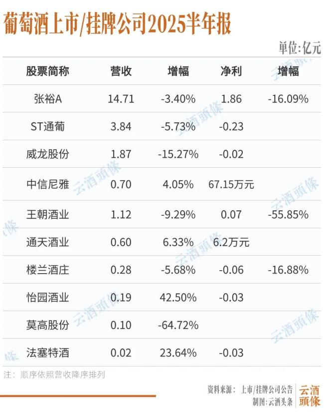 营收前五名企业皆为副增长,其中,张裕(营收-3.4%)、ST通葡(营收-5.73%)、王朝酒业(营收-9.29%)的跌幅均为个位数,威龙股份(营收-15.27%)、莫高股份(营收-25.05%)的跌幅高达两位数。
