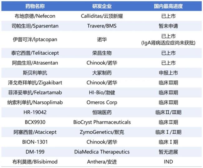 目前,全球只有四款针对IgA肾病的药物获批上市,分别是诺华制药的阿曲生坦、伊普可泮,百时美施贵宝(BMS)/Travere Therapeutics的司帕生坦,云顶新耀/Calliditas的布地奈德肠溶胶囊(商品名:耐赋康®),均为化学药。此外,还有十余款药物正处在临床阶段。