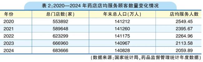 行业进入存量竞争阶段。药店总数从2020年的55.39万家攀升至2024年的68.37万家,单店服务顾客数也从2020年的2549.45人下降到2024年的2059.89人。药店总数同比增长率从2023年的7.00%降至2.50%。业内主流的共识是,2025年药店数量将开始下降,行业从增量竞争进入存量竞争阶段。