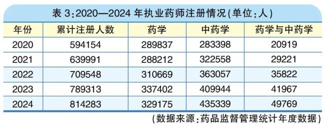 值得关注的是,中药学执业药师数量明显增加。2020年,药学执业药师28.98万人,中药学执业药师28.34万人,两者差异不大,前者人数甚至略多。但在2024年,中药学执业药师已达43.53万人,比药学执业药师的32.92万人多10万+。笔者分析,这一变化的主要原因是,近年药店的中医药品类及相关非药品类销售额增长迅速,需要更多中药学执业药师提供专业服务。