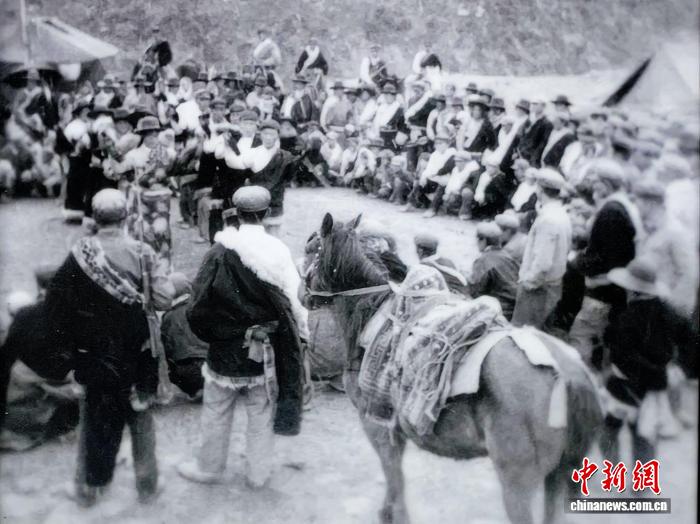 资料图为民众载歌载舞庆祝雪山乡通公路。朵颖供图