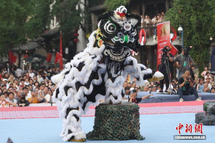 9月27日,在江苏南京举行的2025年世界华人狮王争霸赛传统南狮项目的比赛中,来自中国、新加坡、南非、美国等国家的参赛队伍轮番登台展绝活。图为深圳市宝安区西乡蚝业黄连胜醒狮团的成员在比赛中。中新社记者 泱波 摄