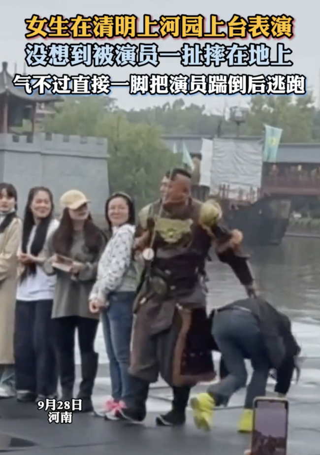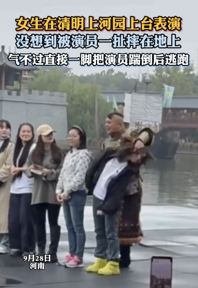 女生上台表演被演员扯摔在地上。女生在清明上河园上台表演,没想到被演员一扯摔在地上,女生气不过起身将演员踹了一脚,撒腿就跑,现场观众大笑!