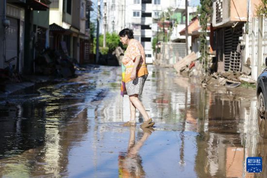10月12日,在墨西哥韦拉克鲁斯州波萨里卡,一名妇女走过泥泞积水的街道。新华社发(弗朗西斯科·卡涅多摄)