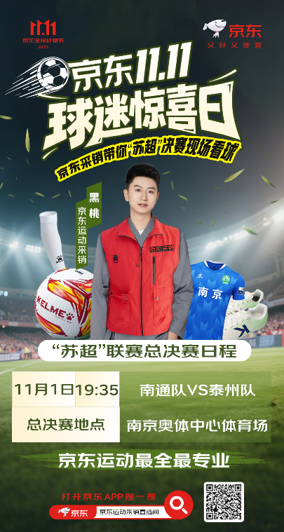 11月1日晚,南通与泰州之争备受瞩目,谁将问鼎首届“苏超”冠军成为球迷们的关注焦点。京东运动采销将亲临“苏超”决赛现场,在直播间为广大球迷直击赛事精彩瞬间,带来赛况解说与装备推荐,让无法到场的球迷也能感受绿茵激情。同时,京东运动还推出“苏超”周边大礼包免费抽、PLUS年卡免费送等福利,赛事同款球衣、正版公仔、定制帆布袋周边等送不停,让球迷们尽享观赛与购物的双重乐趣。