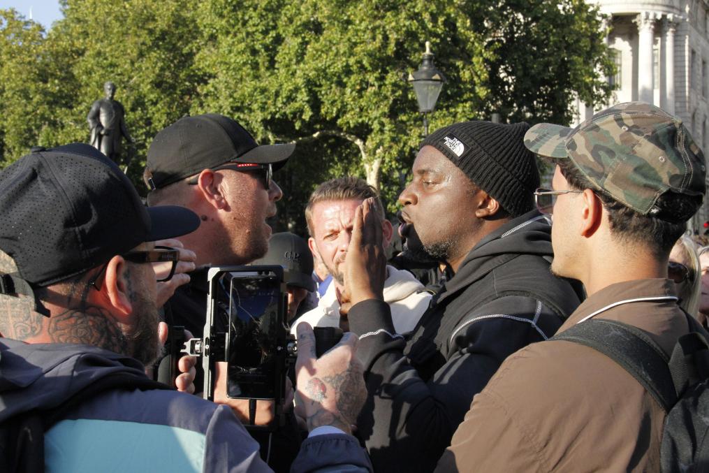 9月13日,在英国首都伦敦,对移民持不同观点的人们在抗议活动现场争辩。新华社记者高文成摄