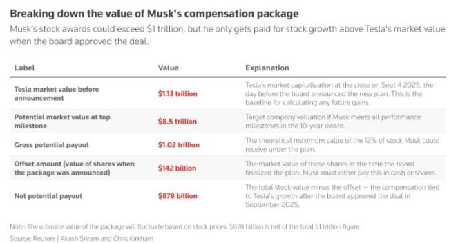 马斯克万亿薪酬背后的十年对赌协议 押注AI与机器人未来。特斯拉股东批准了一项前所未有的薪酬方案,将首席执行官马斯克与公司未来十年紧密绑定。如果该方案完全实现,马斯克的潜在收益可能高达近一万亿美元,这不仅是商业史上规模最大的企业高管薪酬计划,也是对特斯拉转型为人工智能与机器人巨头的一次巨大押注。