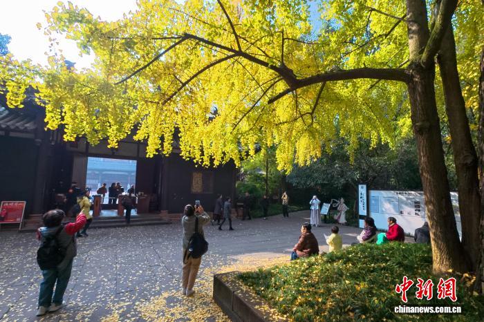 11月24日,初冬暖阳下,四川省眉山市东坡区纱縠行南街的三苏祠博物馆南门内,高大的银杏树渐染金黄,金黄叶片随风轻舞,吸引不少游客驻足观赏、拍照留念,现场洋溢着浓浓的诗意与雅致氛围。图为三苏祠南门游客。中新社记者 刘忠俊 摄