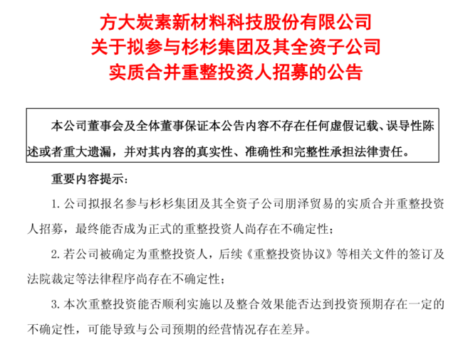 在杉杉集团重整陷入困境之际,方大炭素宣布拟作为产业协同方参与杉杉股份控股股东杉杉集团及其全资子公司朋泽贸易的实质合并重整投资人招募。
