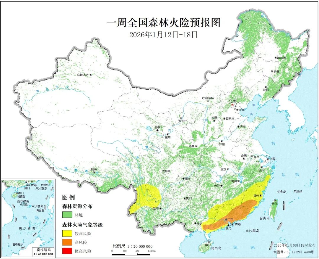 1月12日至18日,浙江南部、福建大部、江西南部、湖南东南部、广东大部、广西东部、四川西南部、云南北部的部分地区森林火险等级为较高危险,其中,福建南部(泉州、漳州、龙岩、三明)、江西东南部(赣州)、广东东部和南部(广州、深圳、珠海、汕头、佛山、韶关、肇庆、江门、茂名、惠州、梅州、汕尾、河源、阳江、清远、潮州、揭阳、云浮)、广西东南部(北海、玉林、钦州)的局部地区森林火险等级为高度危险。