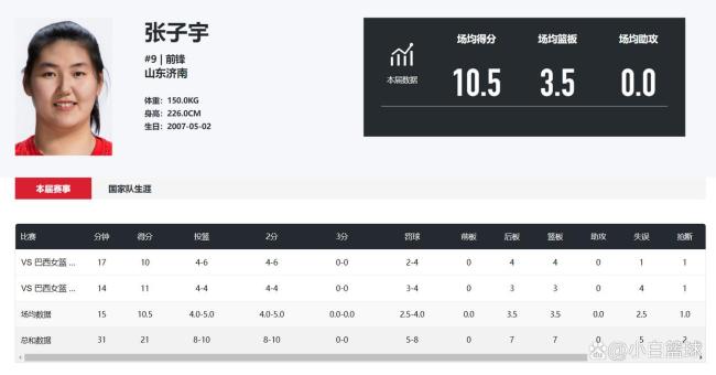 张子宇身高2.26米,是中国女篮最高的内线球员,还未满19岁。她在U19亚洲杯上获得MVP,首次代表中国队参赛就表现出色。宫鲁鸣表示张子宇是女篮未来的基石,不会拔苗助长。对阵巴西女篮的两场比赛中,张子宇均替补登场,第一场17分钟内拿到10分4篮板1抢断,第二场14分钟内拿到11分3篮板,效率非常高。两场比赛场均15分钟,得到10.5分3.5篮板1抢断,命中率达到80%,她的对抗能力也有明显提升。
