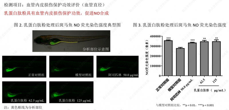为验证其实际效果,拾点壹携手专业研究机构开展了系统性科学评估。以斑马鱼为实验样本,检测报告明确指出乳蛋白肽能显著提升血管损伤模型中的NO生成水平,并下调ACE基因表达,展现出其有力功效。此外,多项国内外动物实验与人体临床研究也进一步证实,持续摄入富含VPP/IPP的乳蛋白肽对支持血管功能健康具有积极意义。从分子到整体、从动物到人体,多维度的验证成果共同构筑了Vaspro®乳蛋白肽效用的实证闭环。