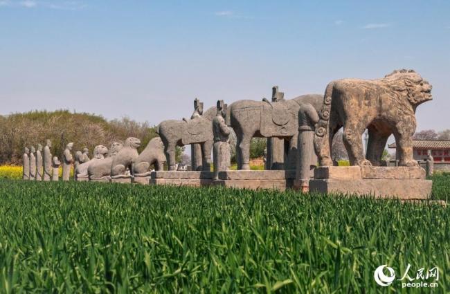 巩义宋陵又称“七帝八陵”,是我国现存最完整的古代陵墓造像群之一,被誉为“露天石刻艺术博物馆”。春日时节,宋陵附近的小麦长势良好。