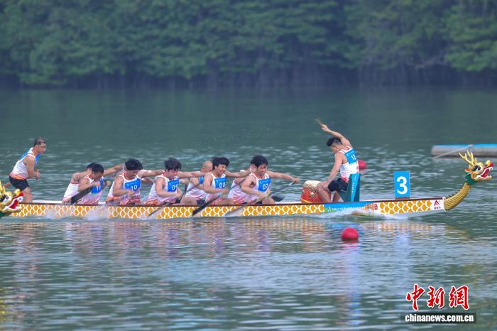 图为泰国队在参加男子组12人龙舟100米直道赛预赛中。中新社记者 骆云飞 摄