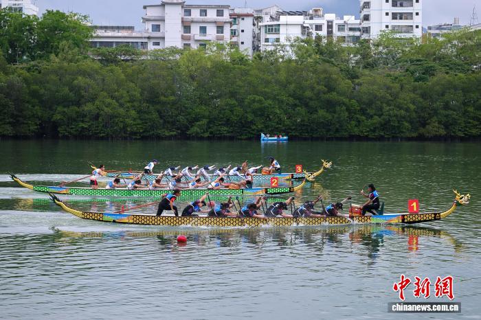 图为参加男子组12人龙舟100米直道赛的队伍在预赛中。中新社记者 骆云飞 摄