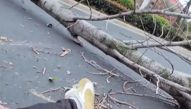 3月18日,江西兴国县将军大道中段绿化带一棵大树突然倒伏横卧马路,一名骑摩托车的市民紧急制动避险时摔翻在地。19日,目击者称倒伏的树木较大,骑车市民自行起身。兴国县城管局回应,系大风将树吹倒,接报后已移走倒伏树木,未接到砸中行人和车辆的报告...