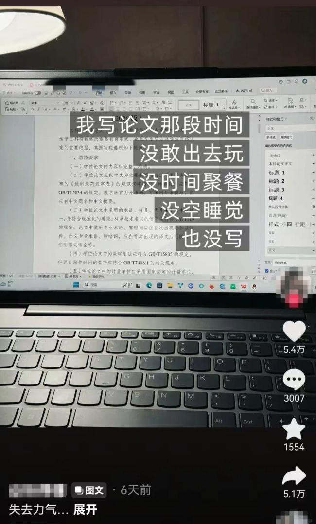 春和景明,万物复苏。美好的春天如约而至,也带来了毕业论文的截止日期。近日,有网友在社交平台分享了自己写论文的状态,短短几句话引起了众多大学生的共鸣