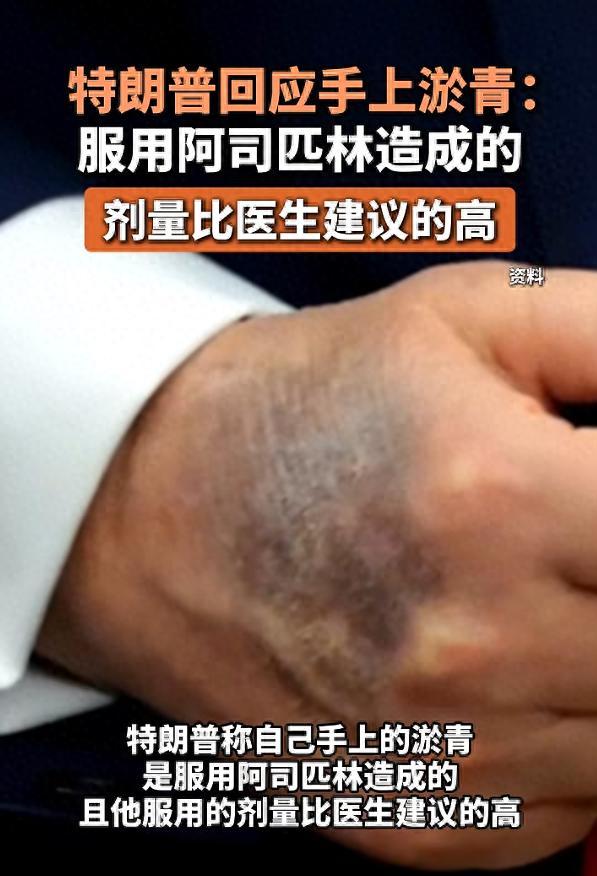 在《华尔街日报》1月1日发布的专访中,特朗普回应了多次被拍到手上出现大片淤青一事。他称手上的淤青是服用阿司匹林造成的,且他服用的剂量比医生建议的高。特朗普解释说,阿司匹林有助于稀释血液,他希望清澈的血液畅通地流过心脏,因此选择服用更大剂量