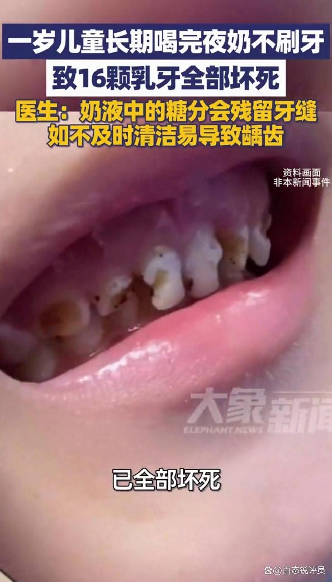 杭州一岁儿童喝夜奶不刷牙16颗乳牙全部坏死近日,杭州一名一岁多的儿童小乖因长期喝夜奶且不刷牙,导致已长出的16颗乳牙全部坏死,引发社会关注。据孩子家长介绍,小乖每次喝完夜奶后便安然入睡,他们因此忽略了喝完夜奶后需清洁口腔这一关键环节。医生在...