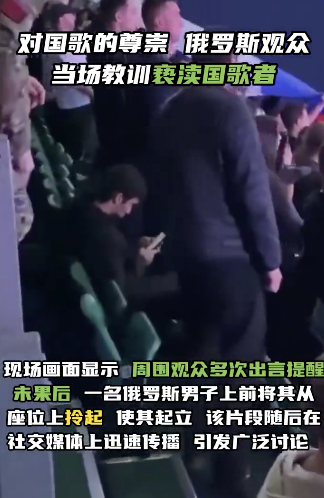 俄罗斯观众当场教训亵渎国歌者。莫斯科时间11月9日,在莫斯科举行的一场综合格斗赛事中,一名外国观众在俄罗斯国歌奏响时拒绝起立致意,反而低头玩手机。现场画面显示,周围观众多次出言提醒未果后,一名俄罗斯男子上前将其从座位上拎起,使其起立。该片段...