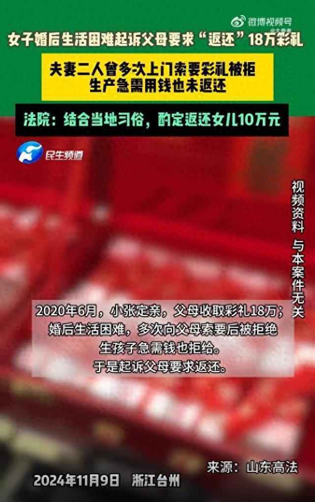 浙江台州的小张在2020年6月与男方相亲后订婚。小张的父母向男方收取了18万元彩礼。婚后,由于丈夫家庭条件不宽裕,生活困难,小张多次向父母索要这笔彩礼以补贴生活开支,但均遭到拒绝。甚至在小张生产住院急需医疗费时,父母也不愿返还这笔钱