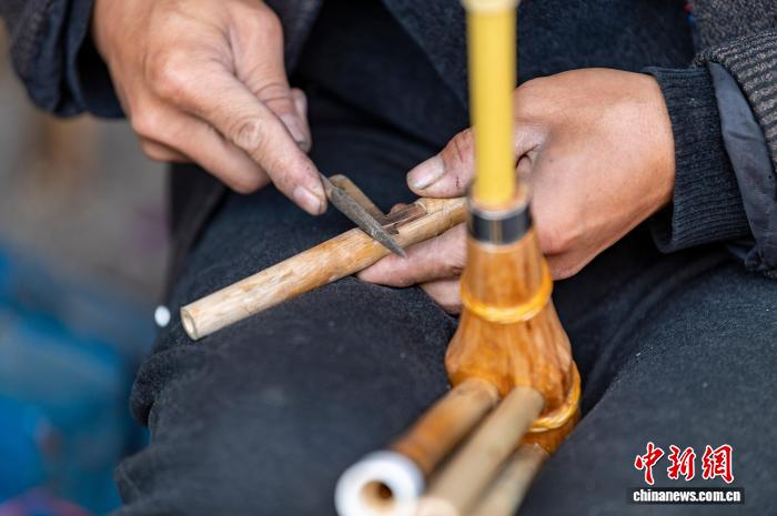 图为芦笙制作手艺人梁光进在制作芦笙管。吴德军 摄 图为芦笙制作手艺人梁光林在制作芦笙管。吴德军 摄