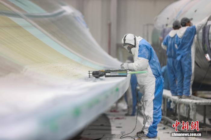 12月11日,工人在打磨风电叶片半成品。记者 瞿宏伦 摄 12月11日,航拍待出厂的风电叶片。(无人机照片)记者 瞿宏伦 摄
