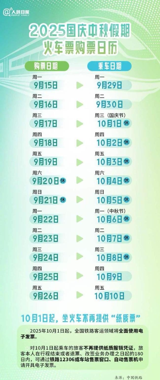 国庆中秋假期购票的关键时间如下:9月16日可以购买国庆前一天即9月30日的火车票。9月17日可以购买10月1日国庆节当天的火车票。9月22日可以购买10月6日中秋节当天的火车票。9月24日则可以购买假期最后一天即10月8日的火车票
